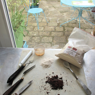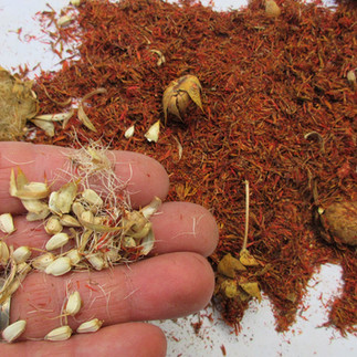 Safflower rose, and pigment from washing waters Let's separate the seeds from the ligules, for it's time to sow safflower seeds A good opportunity to present the method of extracting the famous Indian rose. The ligules are washed with cold water, 7 to 8 times, and well pressed. The washing waters, deemed unusable for dyes, are set aside: later we will make a pigment from them. The ligules are extracted with potash from ashes. They are kneaded in an infusion of wood ashes, several times, but this time the solutions are kept? To make a dye bath, a bit of gall nut is added, then citric acid. The juice turns pink; the linen cloth immediately takes on a nice Indian rose tone. The washing waters of the ligules are added with chitosan. Immediately, an orange pigment forms. It is filtered through a cloth and washed on filter. All that remains is to prepare a binder of gum arabic, and to tube it. This shade has already found a buyer!